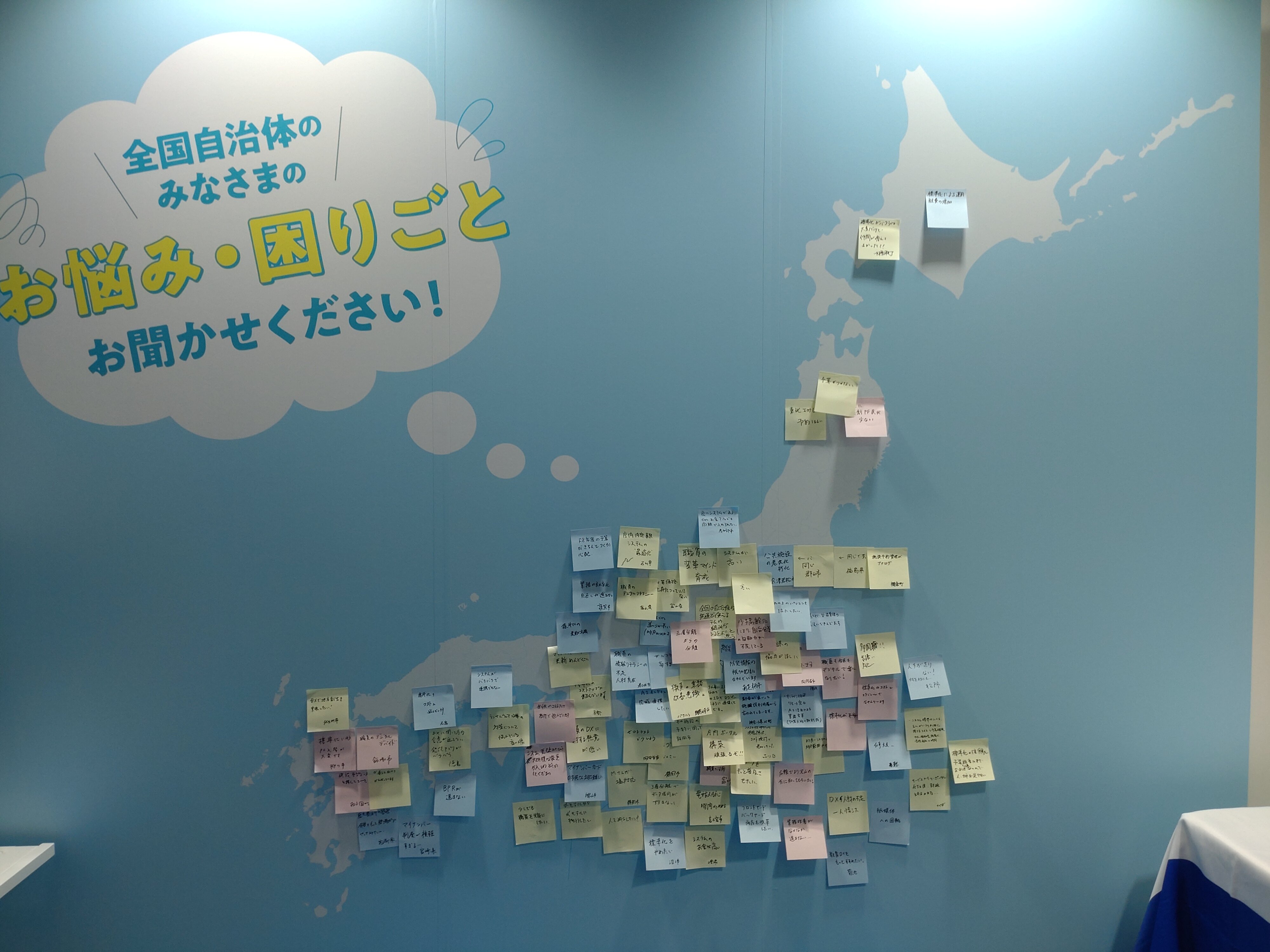 ブースでは、「全国自治体の皆様のお悩み・困りごとをお聞かせください!」と題し、日本地図のパネルに全国からお越しいただいた職員の皆様のお悩み事を直接お貼りいただく企画を実施しました。